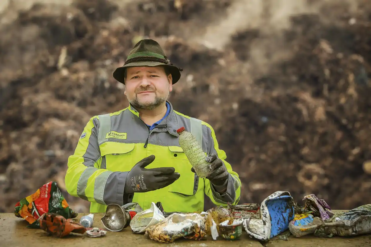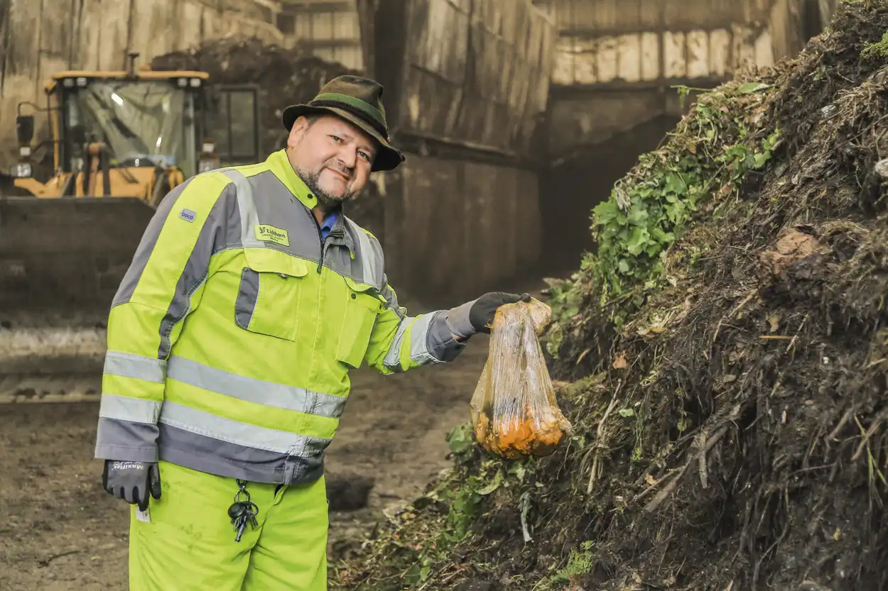 Sebastian Weber, Betriebsleiter der Kompostanlage Bamberg zeigt einen typischen Störstoff in Form einer nicht zersetzten Bio-Kunststofftüte.